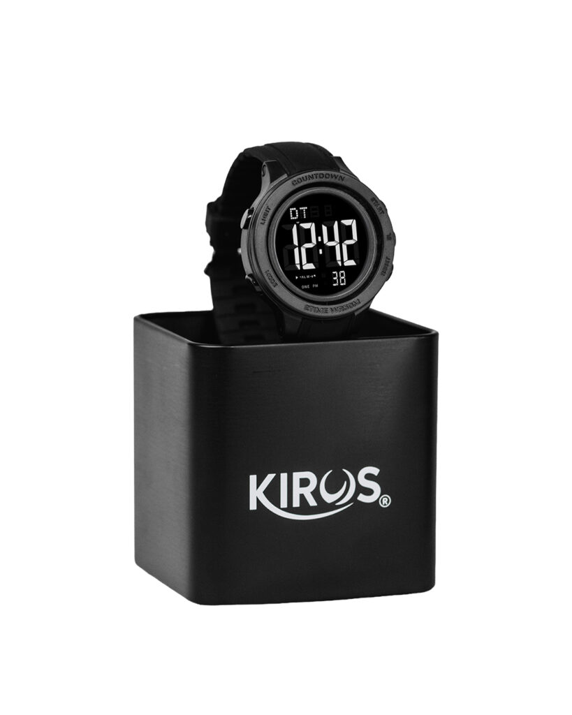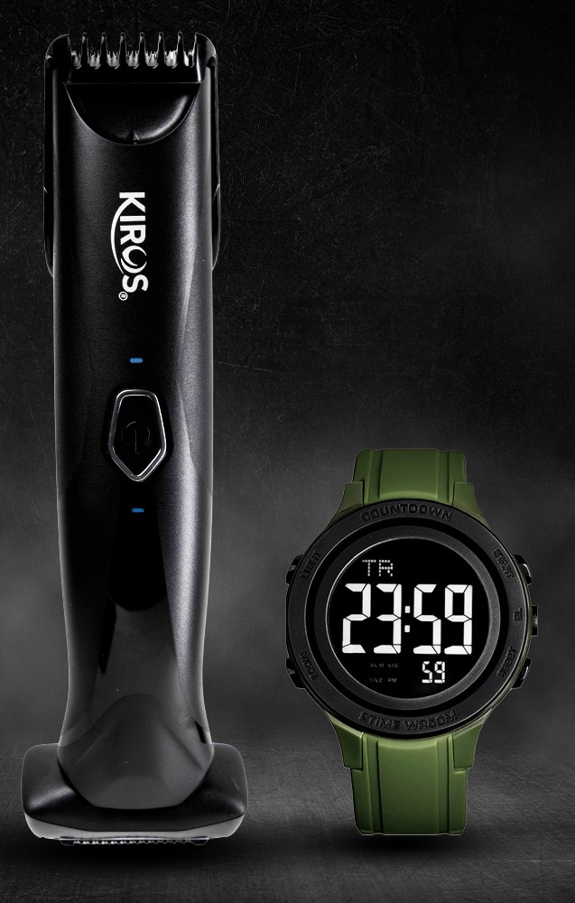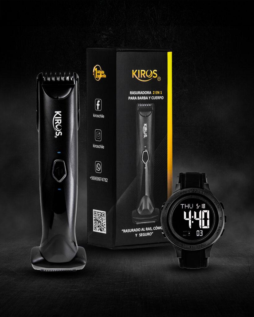 Este set incluye la Rasuradora KIROS 2 en 1, con diseño exclusivo de doble cabezal, junto al Reloj Digital KIROS 2026, resistente, deportivo y de diseño imponente.
